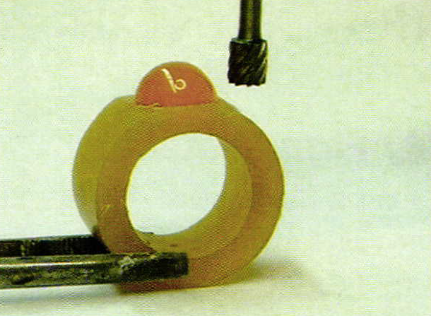 This photo shows the wax blank being spun on my flex shaft. This is a wax carving trick someone taught me years ago. In order to find center, I drill a hole in the top, and very carefully drill all the way through the ring. Then I spin it on my flex shaft and see if it turns true (which it never does the first time). I study the wax to see where it's off center, and then drill a slightly larger hole, cheating towards center. Then I spin it again and check it. It usually takes three or four times to get it right, but the advantage is I now have dead center on the top and the bottom.