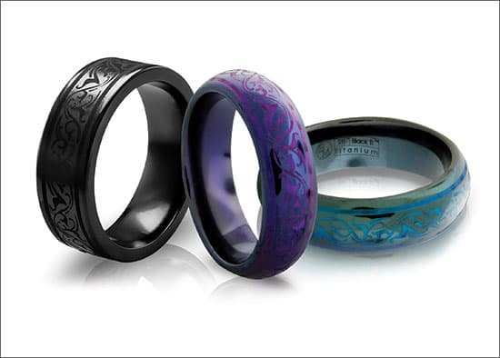 Since introducing laser engraving into its operation more than a decade ago, Edward Mirell of Deerfield Beach, Florida, has experimented with applying the technology as a design tool. In the trademarked Black Ti Rain collection of titanium jewelry, the manufacturer uses the EasyJewel from Rofin-Baasel in Devens, Massachusetts, to engrave elegant patterns on rings, pendants, and earrings. The pieces are then anodized for a colorful two-tone effect, as the process produces different hues of color within the recesses of the engraved design and the surface of the piece.