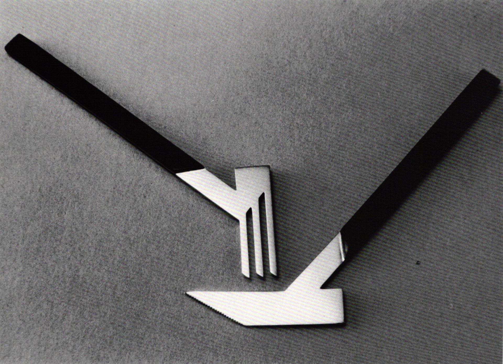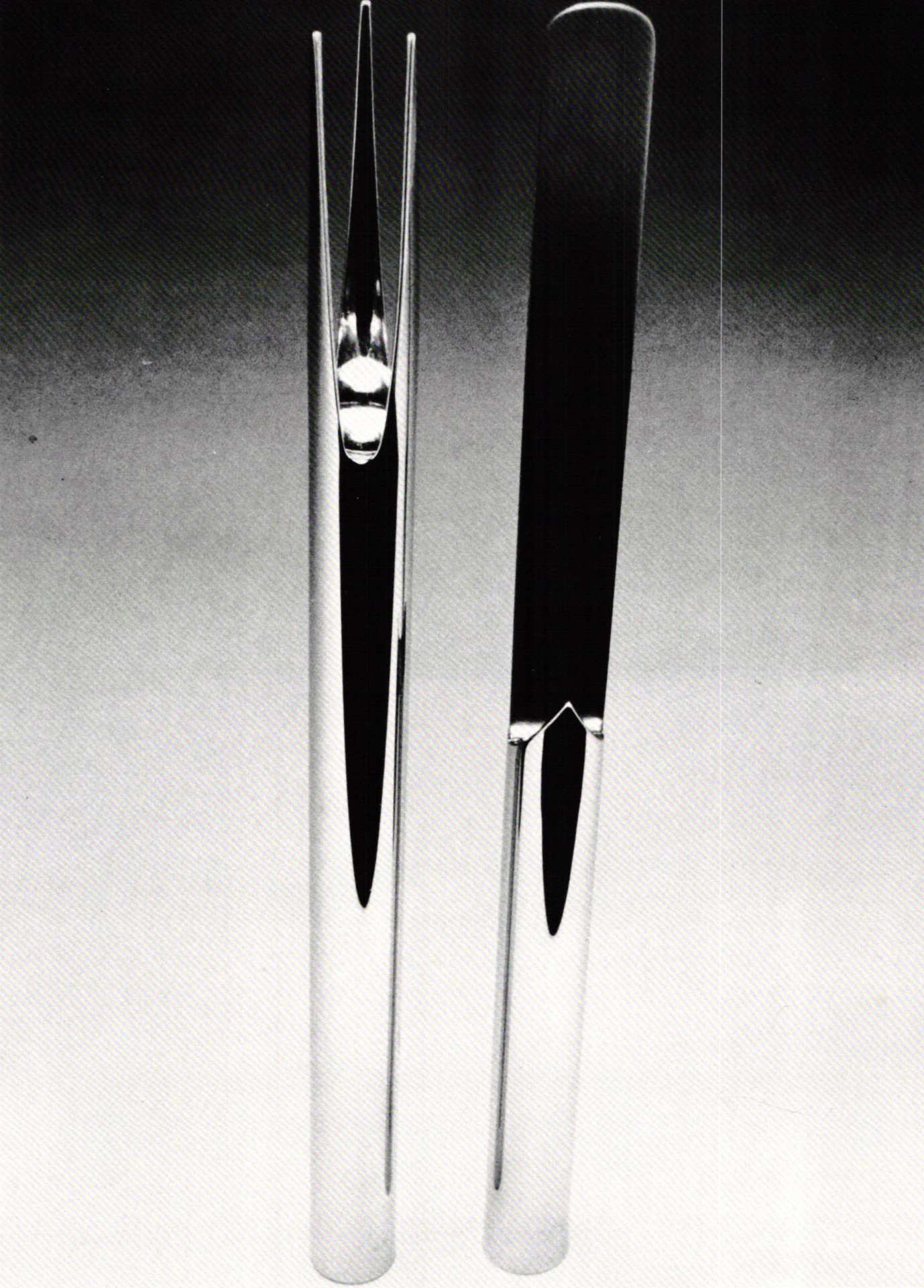 Figure 3 shows demitasse spoon designed by Hans Appenzeller. The design is straightforward and elegant, relying on the lines rather than on any superfluous decoration. An added feature of the design is the way the piece lifts itself in a sweeping manner from the tabletop. Although they certainly do function, notice that the handles are vertically oriented and would have the tendency, whether allowed to or not, to roll to a more stable position in the fingers.