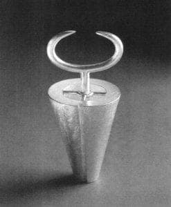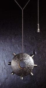 Many of the newer necklaces have equally significant elements in both the front and the back. Sometimes symmetrical and balanced in weight and relative size, these elements create an equilibrium between front and back, though each piece reaches a different stasis as it is worn by distinct individuals. Cones, miniature towers and minarets, and small jug-like forms roll across the body, swing to and fro and with a more active and quick movement the pendant may, for a moment, flip upward, the heavier base twisting above the point where object joins chain or cable.