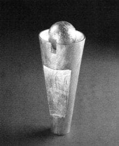 A similar kind of romantic intellect and longing seems to be at play in the work of Didi Suydam. At first sighting Suydam's works appear to be inert little objects, sculptures resting in muteness, containers in simple and almost pure geometric forms. Yet even in their stasis they encourage interaction. The silver, almost satiny surface, created by sandpaper rubbed in repetitive circular motions, invites a caress. Delicately textured areas of 23k gold leaf assure a soft sparkle when the piece is finally moved from rest.
