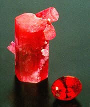 Red Beryl or bixbite is the varietal name for the very rare red beryl. It is only mined in one place: the Wah Wah Mountains of Utah. Red beryl is extremely rare. Only small stones, mostly under one-half carat size, are available and these are generally visibly included. They are an intense red color and resemble very fine ruby. Like emerald and ruby, red beryl has chromium as a trace element, but manganese gives it the red color; it has been marketed as "American red emerald." Prices fall into the expensive category.