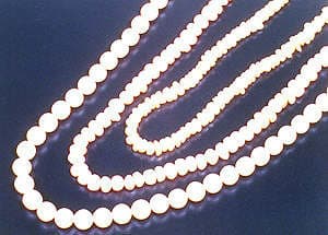Generally strands of cultured pearls are evaluated by millimeter size of their diameter. Uniform pearls are sold according to a half millimeter range in a strand. Strands will be sold as 7 to 6 1/2 millimeters, 5 to 5 1/2 millimeters and so forth. Graduated cultured pearls will vary diameters in strands although common strand size ranges from 3 to 7 mm. The size of the pearl affects value dramatically. The larger the size, the more expensive the pearls or the strand. However, small cultured pearls, between two to four millimeter, can cost as much to produce as five millimeter pearls so strands of smaller pearls may be disproportionally expensive. When cultured pearls exceed eight millimeters they jump drastically in price. For sizes over ten millimeters in the finest qualities, a single pearl will fall in the expensive category. For loose pearls, natural pearls are weighed in grains and cultured pearls are weighed in mommes. A grain is the equivalent of one-quarter of a carat (four grains to a carat) and a momme equals l8.75 carats (or 3.75 grams or 75 pearl grains).