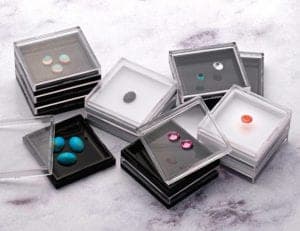Ideal for displaying and packaging faceted gemstones for full visibility, these gem boxes feature a white or black plastic bottom and a lid made of clear plastic. The lids are coated with a silicon-based gel that immobilizes stones, allowing the flat table of faceted stones to adhere securely to the gel without causing harm or leaving residue on the stone. Boxes are designed to stack vertically for easy storage and to fit perfectly into full-size trays. Contact: Rio Grande, 7500 Bluewater Road NW, Albuquerque, NM 87121; 1-800-545-6566; fax 800-965-2329; e-mail info@riogrande.com; riogrande.com.