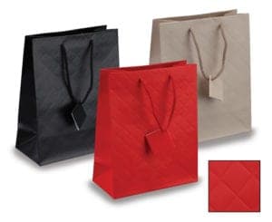 Available in black, red, or nude, these tote bags are constructed from thick paper and feature a quilted pattern. Available in three sizes, they can be customized with a company logo with a 400-piece minimum order. Contact: A&A JEWELRY SUPPLY, 319 W. 6th St., Los Angeles, CA 90014; 1-213-627-8004; fax 627-1653; e-mail info@aajewelry.com; aajewelry.com.