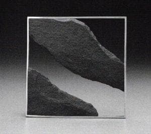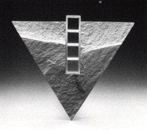 In the artist's own terms: "These pieces are studies in contrast. They are rough and smooth, geometric and organic, precious and non precious, positive and negative. The forms are monumental but the scale is intimate and appropriate for the human body." Upon inspection of the world around us one can see such "studies" abounding everywhere within nature. For example, in 1985 Friedlich was profoundly moved and inspired by a trip which he took to Arizona. He found himself enthralled with some of nature's most breathtaking vistas and monumental creations. In particular, he was intrigued by the effects of time and the forces of the elements which had enriched and articulated each natural form's particular material structure and composition. Two different series of work emerged from his travels in the Southwest: the Interference Series and the Erosion Series. Within these pieces he interprets the effects which the elements have upon nature's creations by cutting, sandblasting and carving the surfaces of his chosen material, generally slate or other stones.