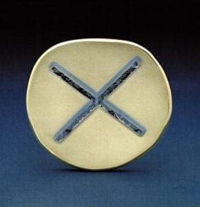 In the Interference Series, geometric expanses of stone are divided or pierced by disparate elements of gold or carved troughs, much the way a seemingly invulnerable plain may be carved by a small stream. The brooches of the Erosion Series, most closely linked with the Arizona trip, have been carved into with a sandblaster, altering or softening their surfaces in order to emulate nature's process of erosion.