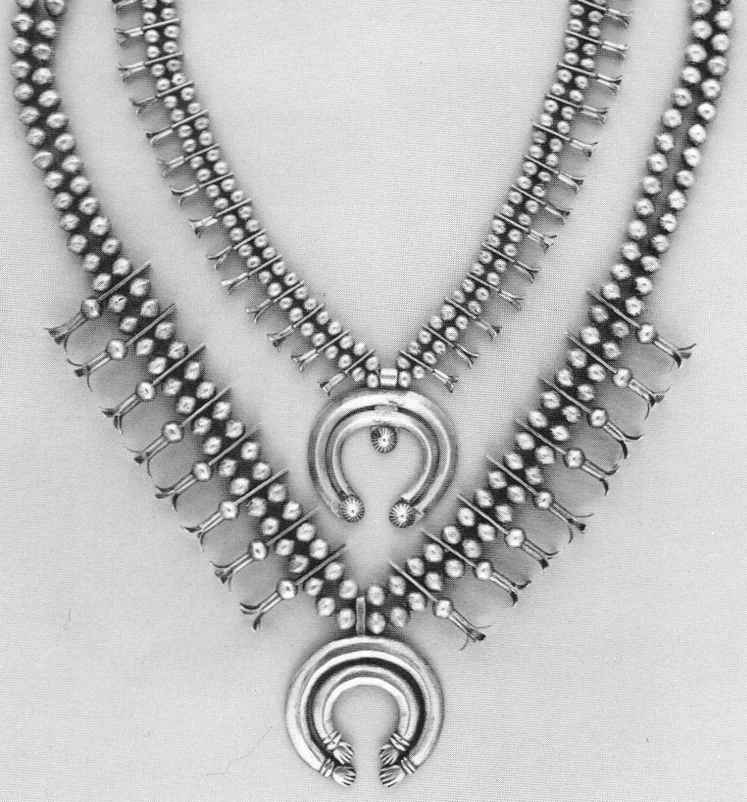 The popular and elegant squash blossom necklace became a special prey of the invented interpretations of wily tradesmen, although its true origins were far more fascinating than the hints of erotic meanings. The necklace consists of silver beads alternating with the blossoms, whose long shanks are pierced for stringing and attached to a round bead, at the end of which pieces of silver are soldered and curved outward like petals. Although there is a resemblance to the flowers of the squash plant, the motif is more closely related to the pomegranate, which flourished in the south of Spain and was grafted onto the coat-of-arms of the city of Granada. Beads with the pomegranate motif were brought to the New World by the Spanish; such beads were often sewn on the jackets and trousers of the Mexicans (p.83).