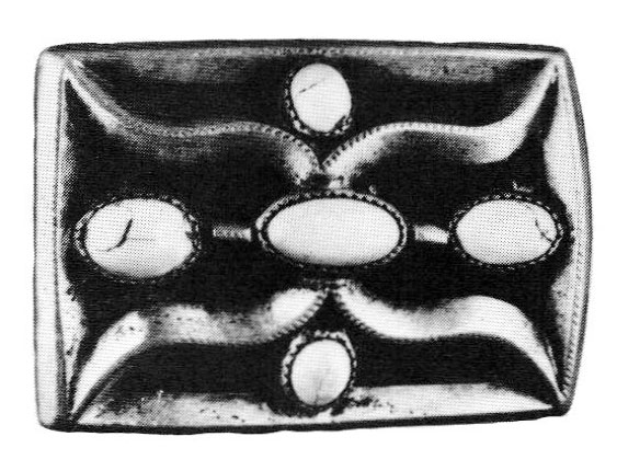 Unlike the Zunis, who specialized in lapidary skills and allowed their use of turquoise to dominate the silver, the Navajo never permitted stones to diminish the contributions of the silversmiths or the turquoise to detract from the smooth sheen and sculptured quality of the metal. When selecting a stone for a setting, the Navajo preferred a large single turquoise cut in an oval, a circle or in a rectilinear shape. A cluster of stones might be arranged around a central stone; for a narrow bracelet. Turquoise was repeated about the band. Compositions developed a firm symmetry, varied by linear repetitions. An admiration for massiveness and balance characterized the goals of the Navajo craftsmen.