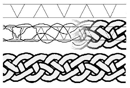 One tip is to use different pencil leads for the trace of the graph and of the interlacing. First of all make a sketch of the interlacing by slogging through the method rigorously without cheating. Then stand back from it and tidy-up the chaotic path of each thread with a beautiful sinuous curve that takes into account the general direction of the thread. Worry less about the over-under and more about the path of each thread. Having checked each crossing to sort out the over-under, take each thread and consider its knot not like a piece of string, but like a tyre; pump it up and let each bit of tyre take its place. At this point I suggest that you try your hand at a simple border based on a triangular ladder with every 3rd rung missing. Copy the graph on a piece of paper and follow the four steps suggested on the second line: