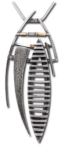 Driven by an impassioned need to process her inner visions, Korsage did not fear any technique; in fact, technique should fear her. For four years, Korsage constructed three-dimensional metal pendants with a small butane torch and a lot of chutzpah. She recently switched to a manageable minitorch with oxypropane.