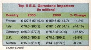 The European Union's gemstone imports were up a solid 7.5 percent to €412.5 million (US$544.4 million) in 2006, mostly on the strength of its growing export market.
