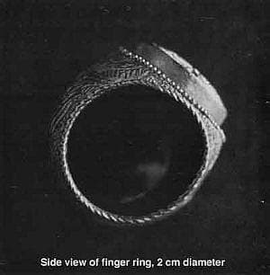 The most remarkable objects discovered were six gold rings with cloisonne enamel dated 1230-1050 B.C. With the kind permission of the Director of Antiquities we have studied the rings closely and have taken photographs. The rings are almost identical. Two were not displayed and one had no contents within its bezel. Three are in good condition. The hoop is wide and broadens near the bezel. It is chased with a flame design and twisted wire square wire is soldered on the edge. The round bezel is made separately from a wide strip of gold soldered to the base and bordered by granulation consisting of two rows of grains. Within the bezel there are cloisons of rectangular gold wire in the shape of scrolls and rings filled with enamel. The material within the bezel is enamel because: