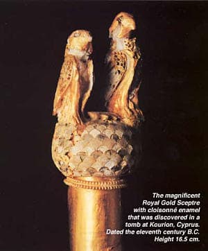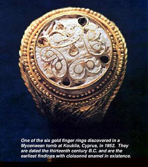 In a Mycenaean tomb that was discovered at Kouklia, Cyprus, in 1952 and dated the thirteenth century B.C., there were six gold rings decorated with cloisonne enamel that appear to have been fused in place. A little later (11th century B.C.) a magnificent Royal Gold Sceptre with cloisonne enamel was discovered in a tomb at Kourion.