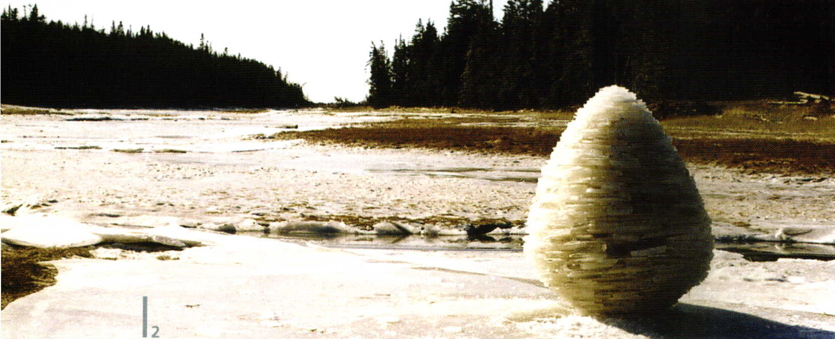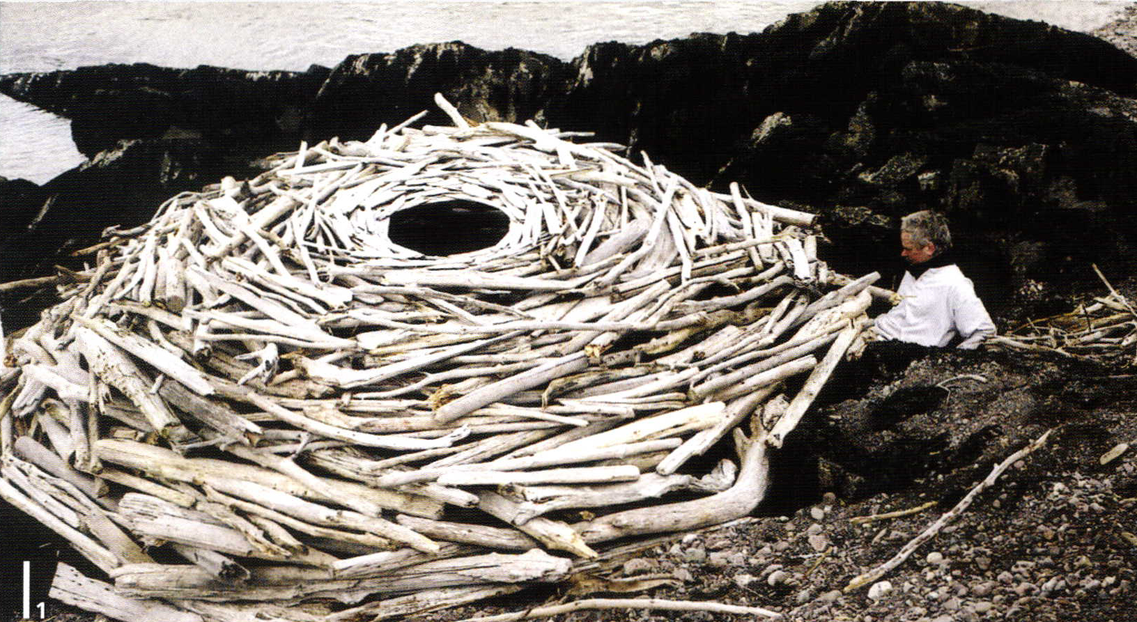 Goldsworthy uses the most widely varied materials found in nature, such as sand, loam. stone, ice, snow, ferns, leaves, wood, and flowers, to create filigreed constructions or powerful sculptures, all of which show an innate, deeply moving poetry And all of them have another thing in common: the inevitability of their transitory nature, whether they are sculptures made of found driftwood or yard-long snakes made of leaves knotted together and then set atop a river current. His sculptures of ice and snow melt in the sun, plants decay, and a single gust of wind can destroy a mobile made of spiderweb-thin stalks bound together by thorns. This very transience is part of Andy Goldsworthy's guiding principle. Where other sculptors take things out of nature and give them new life in other places and different contexts or add artificial materials to them, Goldsworthy's creative process, which is based more on arranging than on producing, has nature, with all its creative and destructive processes, at its center. He does not carve images from the materials he finds in nature as other sculptors would, but rather changes them and brings them together in new compositions. Dead twigs, wilted leaves, wood, and stones, all generally collected in the same place where he creates his works, find new life in Goldsworthy's hands.