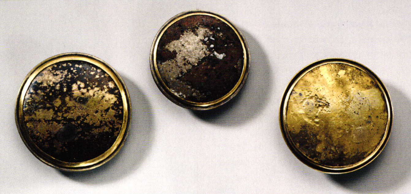 Lately, small series have become an important topic for Erico Nagai, alongside her production of unique jewelry pieces. Her "editions" have developed in two different directions: on the one hand, there is the sphere edition "Infinitas," which began in about 1992 and has matured over the years. Her interrogation of the symbolic character of the sphere, which stands for the globe, for unity and at the same time for variation, and for globalization, is of particular importance for the artist. The point of departure are two pressed half-spheres made of silver, which are then put together to form a sphere. The surface is marked by specific techniques: gold leaf or gold dust is added in free design until the entire surface is covered, and then a coat of enamel gives the sphere its actual patina. Segments large and small - triangles, squares, and rectangles - are cut from this body and then fastened to brooches and earrings with blackened silver. All the pieces come from one and the same sphere, belong to a "family" of sorts - and yet are unique pieces, spread around the world by their many wearers.