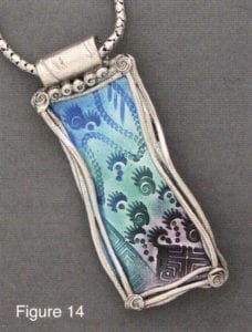 - Sift or wet pack the three enamel colors onto the front of the pendant, blending the colors. Wipe the excess enamel powder from the tops of the coils. It's important to keep the coils as clean as possible. If the coils need to be stoned, the rounded edges will be lost. Fire 2 to 2 1/2 minutes. (Fig. 12)