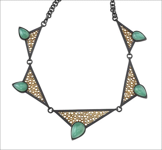 Belle Brooke Barer of Belle Brooke Designs in Los Angeles created a successful union when she brought together 18k yellow gold and oxidized sterling silver in her necklace named for the Greek goddess of marriage, Hera. The design began with five pear-shaped chrysoprase cabochons and an old sketch of a necklace with triangular links. The original drawing didn't have stones, but Barer quickly drew some in, first set vertically, then shifted to an angle. "On the sixth sketchit all came together for me," she says.