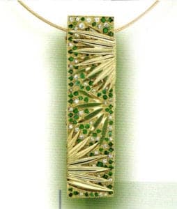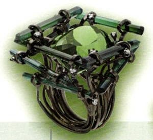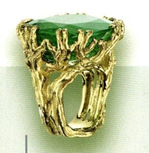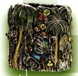 The magic of tropical flowers is depicted by Nathalie Castro who has created a poisonous flower hologram and by Sylvain Gallier in the form of an imaginary flower in his 'Alba' ring. Alexandre Janot prefers the delicacy of ivory which he contrasts with a 10 carat briolette emerald. Nadine Pagliani draws her inspiration from the femininity of the creepers and dense color of a 70 carat pear peridot. Patrick de Pertat, originally a landscape painter, pays homage to the Banyan, an unusual tree which supports the ruins of the Ankor Vat temple, symbolized in the piece by a 50 carat emerald.