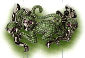 The resulting interpretations of this jungle theme were as diverse as the personalities of each designer. The abundance of nature inspired Jean Boggio to create a 'Jardin Extraordinaire' (extraordinary garden) cuff link consisting of a magnificent miniature painting worthy the great painter Douanier Rousseau. Franck Jals decorated an incredible 172 carat opal with bamboo shoots and glints of tourmaline. Louis Edouard Le Jeune reflects the transparency of the jungle with his openwork foliage and subtle layers of emeralds, tsavorites and tourmalines. Eyvia Gioielli compares the reflections of a New Zealand mabe pearl with those of water in a lake, dotted with vegetation.