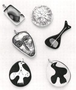 Alexander Calder's esthetic was admittedly the greatest influence on Ed Levin's jewelry in those early years; that and a passionate love for the ancient and tribal informed his designs. One of Levin's first and most successful pieces was the Fruit brooch from 1952. Exhibited in "Designer Craftsmen U.S.A. 1953" at the Brooklyn Museum, it stylistically typifies the era. The brooch is comprised of teardrop, crescent and bullet-shaped forms of ebony, amber and ivory, respectively, which have been pierced by silver wires attached to a surrounding silver frame. The configuration is reminiscent of the lines and shapes of a contemporaneous stabile by Calder of the whimsical images seen in paintings by Miro or Kandinsky, or in monotypes by Bertoia. The Dove pendant reminds one of Braque's mythologically inspired jewelry, while another brooch Egg Box Construction from 1958, recalls the paintings of Mondrian. It too utilizes openwork styling along with suspended forms; in this piece beads of pearl, coral and jade are speared through their centers and are thus linearly suspended. All in all, the jewelry from the 1950s is consistent with the work of Ed Wiener, Betty Cooke and Milton Cavagnaro, to name a few of Levin's peers on the East and West coasts.