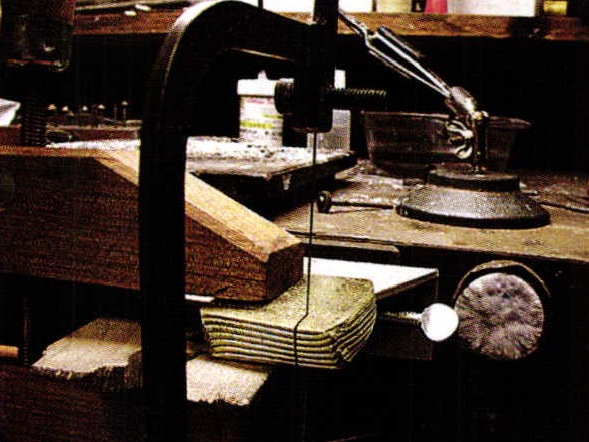 The last billet I made, in the first part of this article, was used before I could photograph the next process, so I've made another. The pictures here show the new billet that I made. This is a really thick billet as it consists of 30 sheets comprised of 18 kt. 18 ga. Palladium white gold, 18k green gold and 24 ga. Sterling silver between each of the gold sheets with a total weight of 200 dwt. This billet is 1 inch thick and must now be reduced by at least 1/3 or more before doing anything else. This is where you will need an anvil, some big hammers, and a pair of tongs. Pictured here is the anvil and the three hammers that I use. The one at the far left is a 3 lb. forging hammer on which I have polished the face. This will be used later. The hammer in the middle is called a flatter, and in the right of the picture is a small 5 lb. sledge.