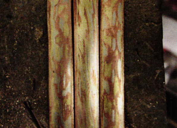 The next photograph shows all three pieces of stock lined up and you can compare the different designs that were produced. These patterns are by no means the only ones that can be done. Remember to constantly look at the stock with a loupe to see how the pattern is progressing. It's very similar to a canvas and a painter adding color. Don't be afraid of removing the metal. I know in the back of your mind you are thinking, my God look at all this waste. Get over it and move on. Oh, and you may want to develop a good relationship with your refiner. He's going to be your best friend.