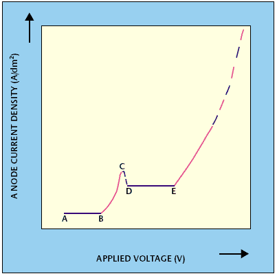 To explain how electropolishing is achieved, it is necessary to examine the anode polarisation curve which plots current density against applied voltage, Figure 8. Such curves are characteristic for each electrolyte and metal item. If we operate the electrolytic cell at the low voltage portion of the curve A - B, nothing much happens to our jewellery. At higher voltages, in the region B - C, etching of the surface occurs and this will reveal details of the metallographic structure of the surface under the microscope. In the region D - E, the current density remains constant, despite increasing voltage. This is the range where good electropolishing takes place. This is where we operate the process! At voltages higher than E, the current density increases rapidly and there is gas evolution at both cathode and anode which is undesirable for a good polished surface.