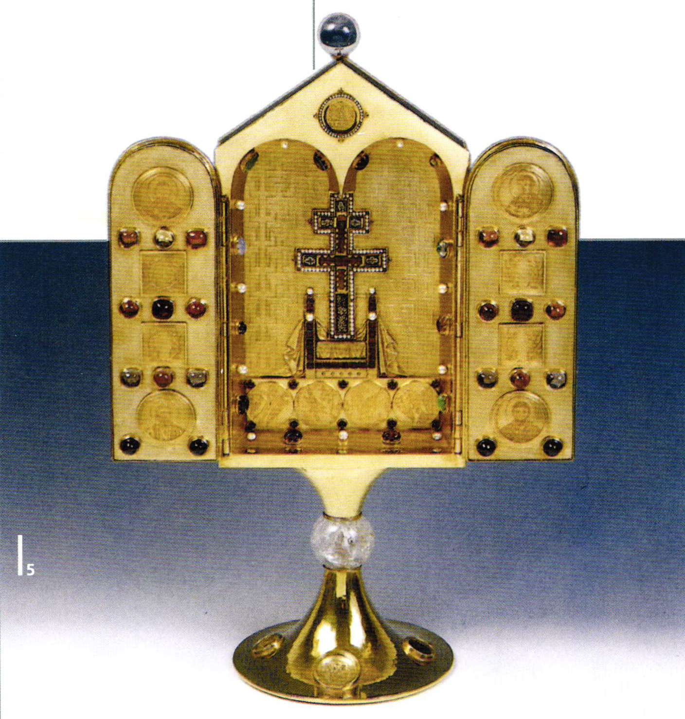 Crucifix particle relic (using a crucifix relic from the 11" century), gold-plated silver on a wooden core, granulation, wire soldering, 1956-58