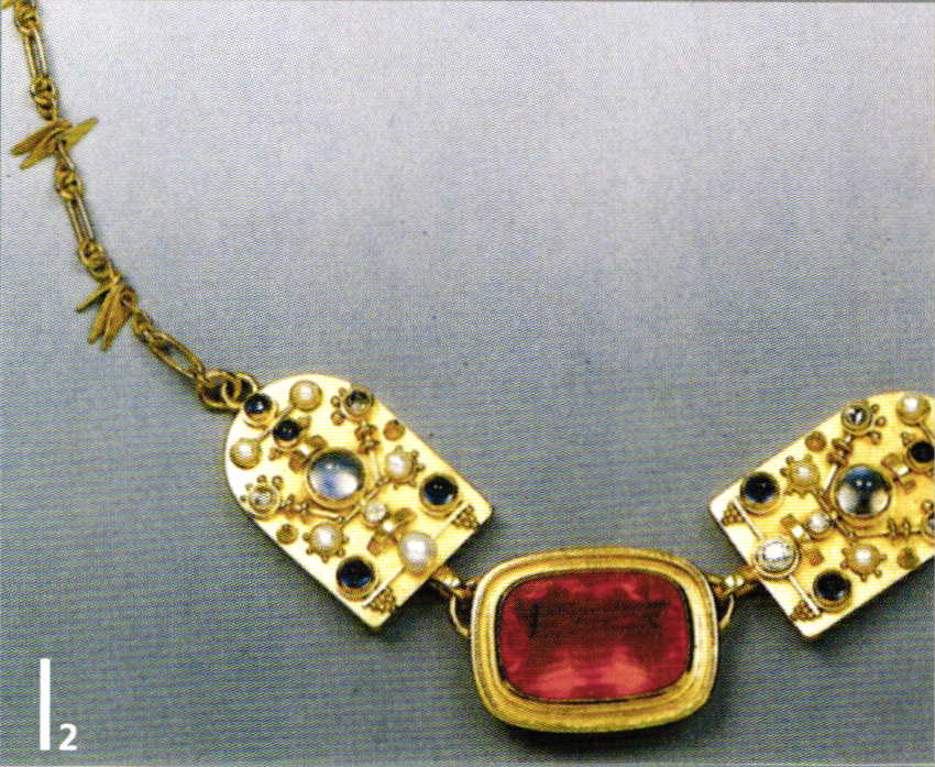 Necklace jewelry, gold, granulation, wire soldering, chrysoberyl cat's eyes, faceted tourmaline, yellowy green demantoid, 1958
