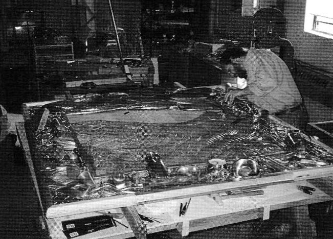 As intricate as the fabrication of 75-plus elements was, the landscape's 20 separate pieces were even more difficult to handle. The longer sections of cloud and sky were up to 4 feet long, quite a challenge in a traditionally outfitted metalsmith's studio. Forming and texturing was complex due to the necessity that all the edges meet without gaps and without being soldered. All of the sections were fitted with bolts and keyed into one another. Given that a 6 x 6 foot relief is largely constructed lying flat, I also needed to frequently climb a 10 foot ladder in order to view the work at its normal distance. This enabled me to make critical decisions concerning forms, textures, and the placement of elements. This need for constant adjustment also meant that adding the fittings to the pieces had to wait until all the forms were complete. The total weight of the metal used to cover the 36 square foot area ended up at 50 pounds. The wooden underbase added an additional 80 pounds to the piece.