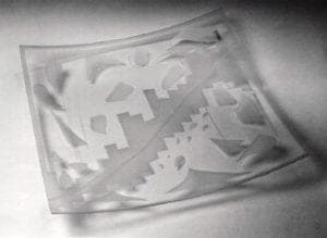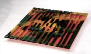 When the old glass had been used up, I began to miss color in my work. I began by using the glass paints provided for use by the free academy, but these paints did not satisfy me. I missed the bright colors of the Thompson enamels I had become familiar with. Luckily, Thompson also sells enamels for use on glass, and it was not long before I began trying these out. I realize that I still have a long way to go to get my glass objects exactly as I want them to be, but I remain intrigued. I have tried out several ways of working with glass enamels of the 5000 and 6000 series for window glass. At first, I made the mistake of dusting the enamels on too thinly. When I began placing a sheet of white paper under the piece of blank float glass resting on some glass stilts, it became possible for me to see if the layer of enameling powder on the glass had been evenly applied, and if it was laid on thick enough. I also found that it is necessary for me to put Klyr-Fire under the enamels to keep them in place. (When enameling, I only use Klyr-Fire for undersides, sloping surfaces, and for the application of lumps, threads, or foils to an already-enameled surface.)