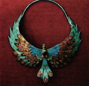 The designs for Hali Baykov's work are clearly inspired by fauna and flora, as well as by fantasy, so that the elusive natural forms and colors are translated into the medium of metal and enamels. The more complex designs, often effectively representing miniature sculptures, are necessarily highly planned constructions. That planning is especially needed for the subtly mobile, or tremblant, elements of neckpieces and tiaras. Collar-style neckpieces are usually made to measure for the intended wearer, so that everything lies correctly and can be easily put on and taken off. The closures are elegantly integrated, for instance, in the style of an S-shaped spring, coming together and holding a neckpiece by slight tension.