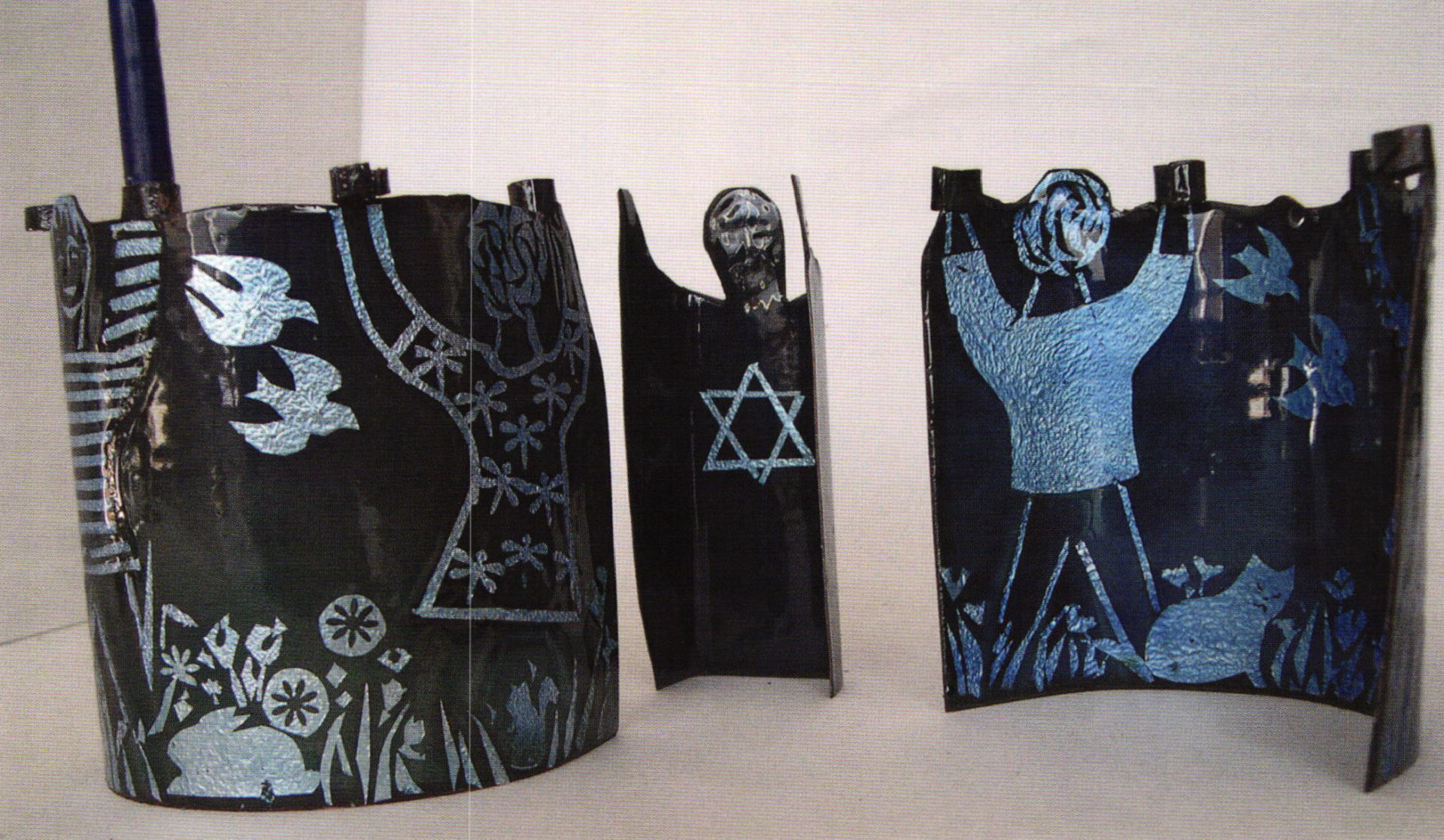 When I was asked to make an enameled Menorah last summer, I agreed to try. The only ones I had ever seen were branched candlesticks and I knew I couldn't do that. So, I surfed the web and was amazed at the hundreds of different Menorahs that appeared…anything goes! Some for children had cartoon characters, some had little chairs, each holding a candle, or nine little houses; made of metal, clay, glass, stone, wood, or even plastic. The only enamels were decorations on the base of the many branched ones.