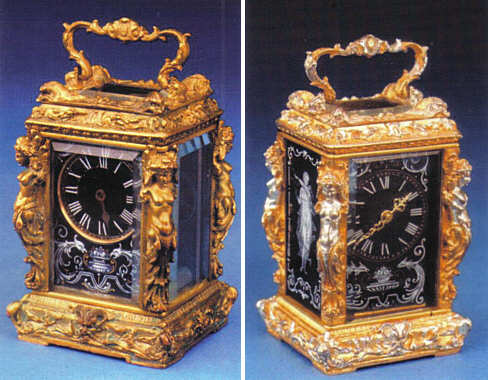 Small ornamental clocks were among the medium priced ornamental objects that were in huge demand in the 19th century. This gave opportunities for enameled decorations to be added for a valuable, individualistic appearance for every piece, even when the actual metal clock housings were mass produced to a standard format. One of the most successful styles was the copying in miniature of the larger, square-cased portable clocks widely used in the 19th century and known by their French name of pendules portative or otherwise as carriage clocks. These had the important attribute that the movements did not lose accuracy when these clocks were moved about. This was a breakthrough of the period in clock design and the clock cases were made to be robust and with swing handles.