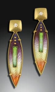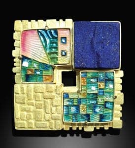 She first turned to using semi-precious stones to try to bring that color to the work, but wasn't finding the kind of creative freedom she needed. "I was frustrated by the limitations of buying gem materials only in shapes that other people had cut," she says. "Although at that time, in the early '90s, there was some interesting lapidary work being done, I wanted to have more control. My choices came down to doing my own lapidary work or enameling. To be honest, I thought, these are both beautiful, but what would I rather do? Stand in front of a lapidary arbor that is making a lot of noise and spraying water at me all day long, or sit at a desk, be contemplative, listen to classical music, and enamel?"