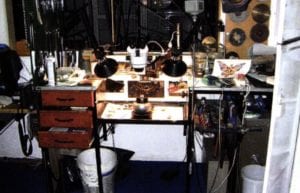 Fig. 4 This is the bench where I do my carving. The fairy piece is mounted in the engravers ball, and I use a stereo microscope with various pictures of a woman's anatomy, like hands, feet, faces, etc. It is absolutely essential to have these references to carve.