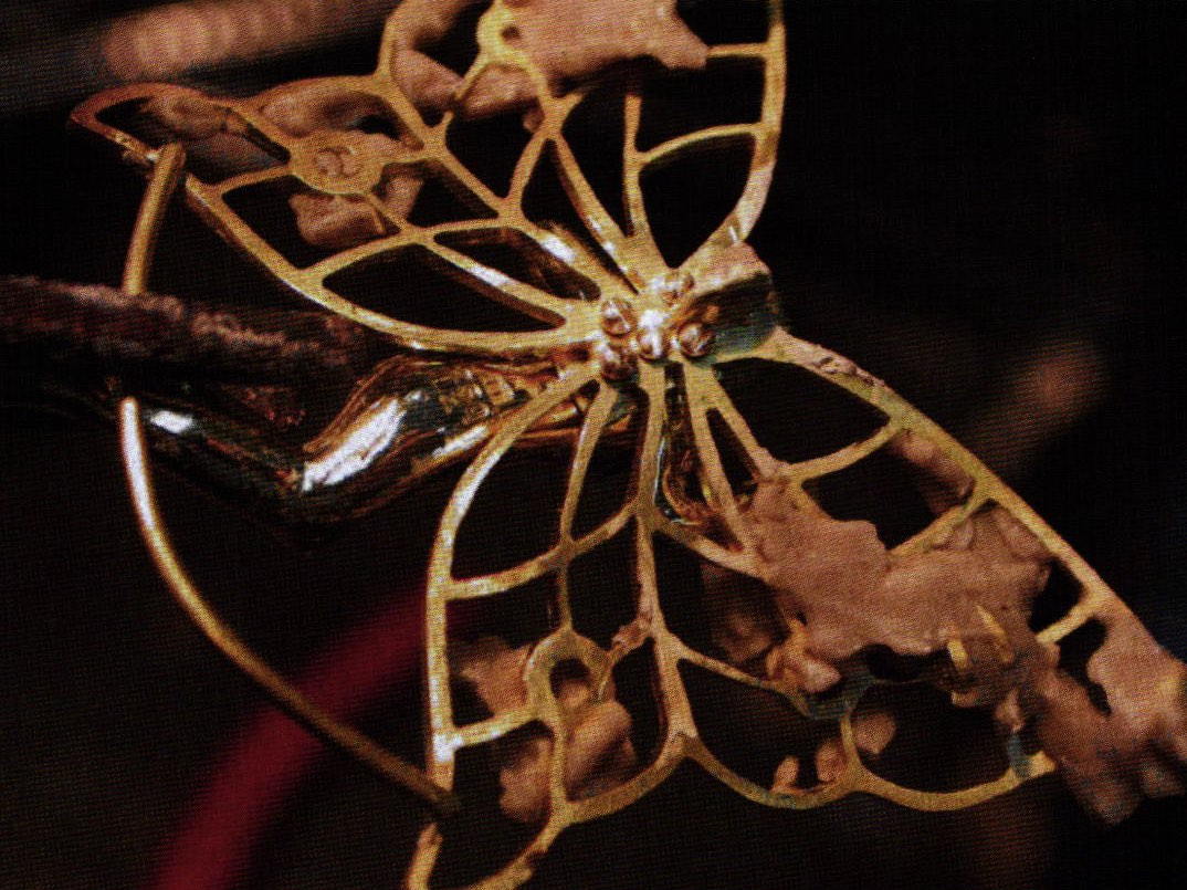 I put a thin layer (.05 mm) of annealed copper behind the wings. I carefully cut it out and bend it over the edges. The design was such that I had to make two little caps for the tips, and I took this picture just to show the caps. The trick here is to get the copper flush against the wing lattice, so that when the enamel melts, it does not run between the copper and gold.