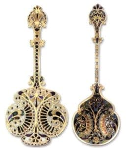 The spoon on the right represents David Andersen's very finest design and technical enamel work. It features many cells having multiple colors blended, culminating with the opposed fans precisely formed with 5-color single cells, a tour de force. The wire work of this spoon is much heavier than standard, and the harmony of its design and the perfection of its challenging enamel leads me to suspect that it might have been made for exhibition. It seems too great an investment in primary talent for commercial inventory.