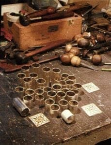For guilloché enamelling the preparation of the colours, their application and firing have to follow the most precise sequences and need very controlled firing. This includes grinding the enamels from lump into powder with evenly sized grains, varying the fineness of the paste made in this way according to stages of completion. The control of the final depth and smoothness of the glaze is vital, and for finest guilloché work the last stages are those of crowning, or fluxing: that is, by adding a finishing coating of clear glass (flux). The fluxing stages require two or three fine layers of enamel, fired and stoned down to keep the final coating very thin and smooth. That is followed by refiring or by the long process of hand polishing. In this way the colours are left lustrous and flawless, and perfectly flush with the metal borders or divisions of the piece. This manner of fine guilloché work was the speciality of the Genevan ateliers and the craftsmen trained in succession by masters in these methods. This calibre of guilloché work, with its visual illusions of moiré patterning and great brilliance, had become renowned for the ornamentation of gold snuffboxes in the eighteenth and nineteenth centuries, and for other costly objects of vertu. Guilloché is, of course, now best known to the general public in connection with the acclaimed display pieces made in the early 1900s in the Fabergé workshops. The transmission of these processes depended on direct teaching, and Alan Mudd is one of the now very rare experts to continue to the present in such enamelling methods.