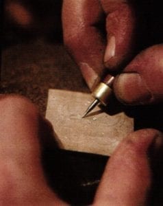 Alan Mudd has focussed on champlevé and in guilloché enamelling in the manner of the Genevan method that has been paramount for luxury objects. He has worked too in other techniques, including painting. For guilloché in the Genevan method, the underlying steps include the preparation of the metal bases either by engine turning, which is undertaken with large, complex ornamental turning lathes by other specialists, or the designs are created by the engraver-enameller by hand work in the flinking style. This preparation gives the metal precisely cut, slightly angled incisions in parallel geometric, phased waves and other patterns in such a way that there is maximum reflectivity of the gold or silver surface. When clear enamel colours are fused over such a surface in thin layers, the translucent zffects are increased and a duality of hue is produced. The combination of patterning and colours is usually with straight line designs coated with deep colours for strength of hue, while the pale enamels are laid over curving designs to enhance the clarity and limpidity of the glaze.
