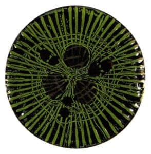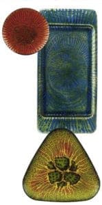 In her work Davidson frequently uses pieces of glass of varying sizes to create irregular organic shapes which she calls "jewels." These raised forms appear to float on the liquid surface of the vessel or plaque. For many of her abstract compositions, she also uses a sgraffito technique, incising straight lines with the sharp point of a dart. These hand-drawn lines, which fan out from a central focal point, present a linear counterpoint to the more fluid, organic and sculptural form of the jewels.