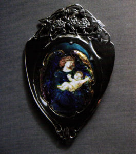 The Alexander Fisher piece "Guardian Angel" is stunning. It is a chased and pierced silver shield (11.2 by 7.4 cm) with a large enamel on copper plaque depicting a kneeling woman holding a child. Most of the plaque is done in transparent enamels with bits of foil, but the angel's and child's bodies are rendered in opalescent enamels. The opal enamel is built up in layers, in the moriage technique, to give a three dimensional roundness to the figures.