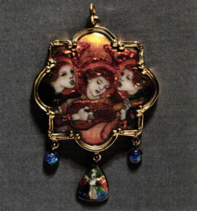 The central plaque has three pre-Raphaelite figures. The women's faces are rendered with a pale, pink opalescent enamel. The faces and hands were developed in relief by applying many layers of the opal enamel and building it up higher than the rest of the plaque. The facial features and fingers are delineated with dark gray painted lines, which are much more delicate than a true black would have been. Delicate, painted lines of gold are also used to show form.