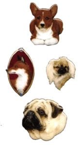 Top Basenji puppy "Larry" enamels over copper with over glazes, Left Fox head, enamels over copper with over glazes, Right Tibetan Spaniel head enamels over copper with over glazes, Bottom Pug head study, enamels over copper with over glazes