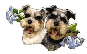 "Mojo" & "Missy" Miniature Schnauzers with bluebells, enamels over copper with over glazes