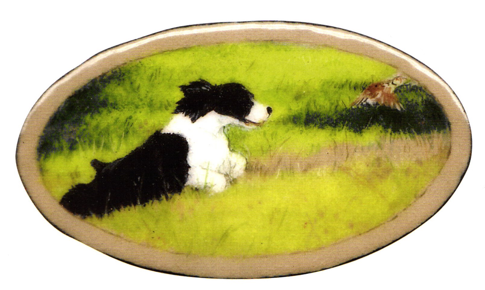 Her work includes her ready-to-buy standard designs, pieces in which she customizes those designs, and one-of-a-kind commissioned works. A perusal of her inventory astounds the viewer with its variety: there are dogs, horses, foxes, cats, birds, African animals, farm and woodland animals, and flowers. Custom commissions range from enameled portraits of some of the best-bred animals in history, to much beloved mixed-breed pets rescued from shelters. When asked how she arrived at such a of work, she smiles.