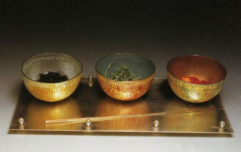 Perkins's explorations of material desire and the less tangible desire for ceremony also became the subjects of two more recent series, begun in the fall of 2001 following her return from an emotionally moving trip to India . The "Itradans," the first of these series, consists of trays bearing sets of three small enameled-silver cups, the gold-leaf interiors of which contain powdered minerals or substances such as rose petals, sage, or charcoal. While the purpose of these ensembles is not specified, their inspiration is in the groups of small bowls containing powdered pigments that Perkins observed in the entryways of some Indian homes. Accompanying her vessels are long, slender forged gold or silver implements spatulas, tweezers, or simple rods - suggesting a myriad of possible applications but committing to nothing definite. The implication of a ritualistic purpose is critical, but the actual use to which the sets might be put is tendentiously ambiguous. Perkins's goal is to elicit through her work an elusive desire for meaning. Above all, the conceptual aim of her vessels is not a positive presence but a sense of perpetual lack, a need that cannot be fulfilled any more than it can be ignored.