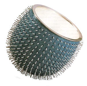 Perkins's intent to thwart the easy visual consumption of her works takes a slightly more malicious turn in another recent series, the "triple Cups." Named for their construction as double walled-vessels whose exterior surfaces are extended into invisible planes in space-implicitly, third cups-by stubby rows of equal-length, blunted silver wires, the pieces clearly bait desire. The frosty white interiors are alluring but off limits to fingers that would damage their fragile oxide finish. The shiny exteriors, covered in candylike translucent enamel, are even more seductive, and even more obviously untouchable. Inspired by menacing seed pods encountered on the Konza Prairie in Kansas , the prickly cups are maddening, threatening to the very hands- that their glassy surfaces entice. As in her other vessels, Perkins employs the physical surfaces of her "Triple Cups" to disrupt a figurative superficiality. By making the works impossible to grasp easily, she has therefore transformed them from simple attractive objects to symbols of frustrated desire. The only surfaces of the "Triple Cups" that can be touched, the tips of the projecting wires, are neither particularly desirable nor even proper surfaces.