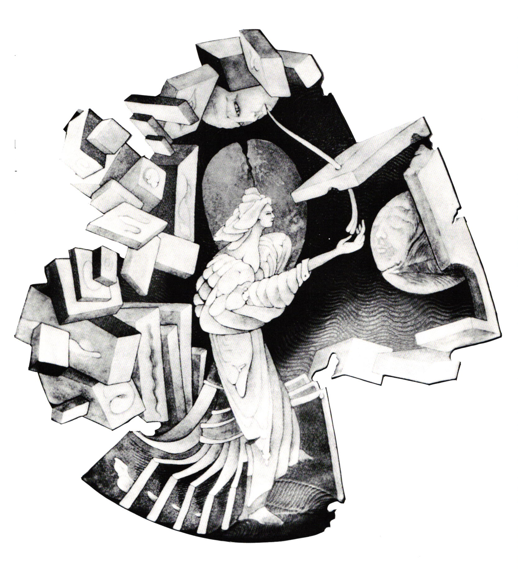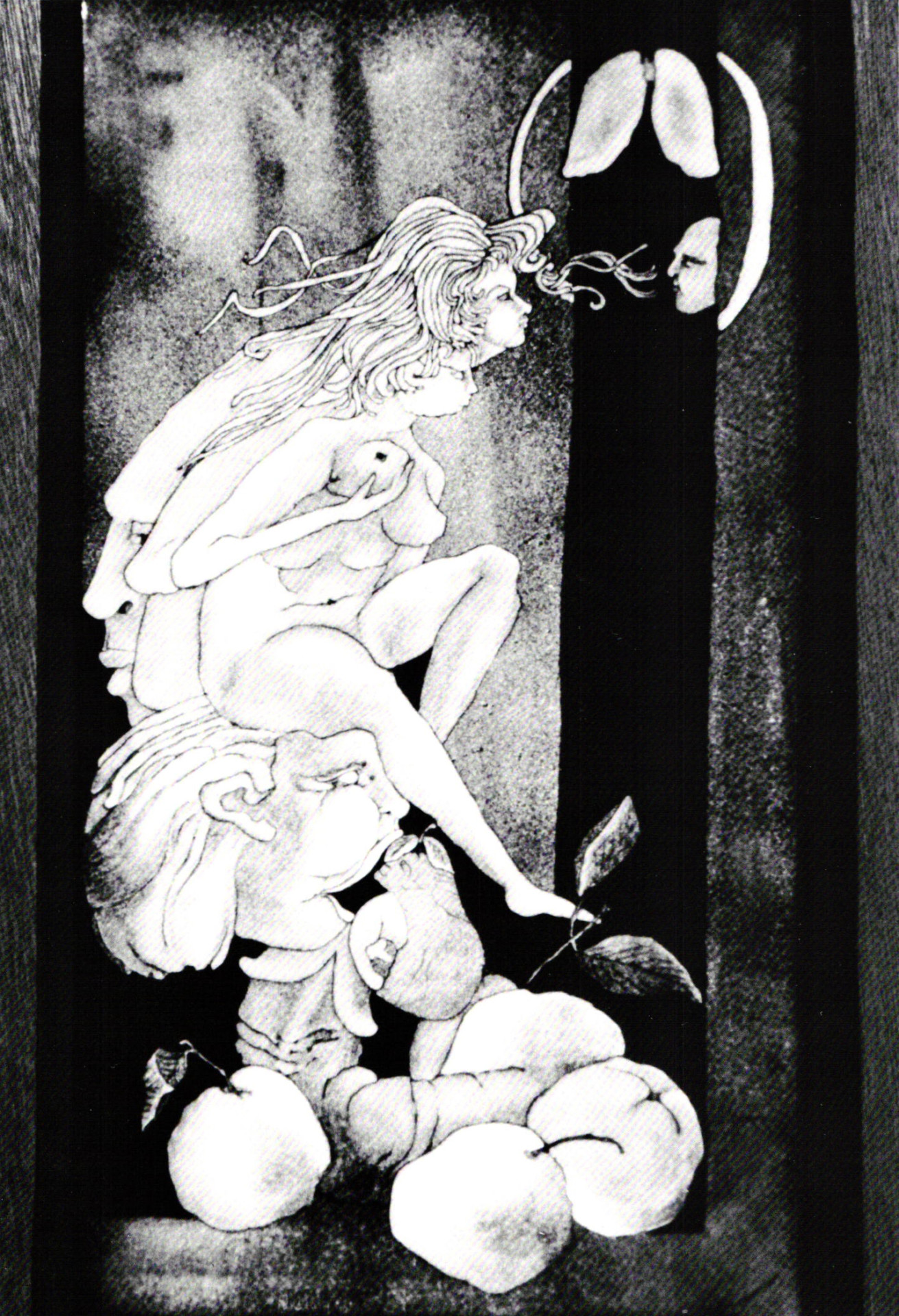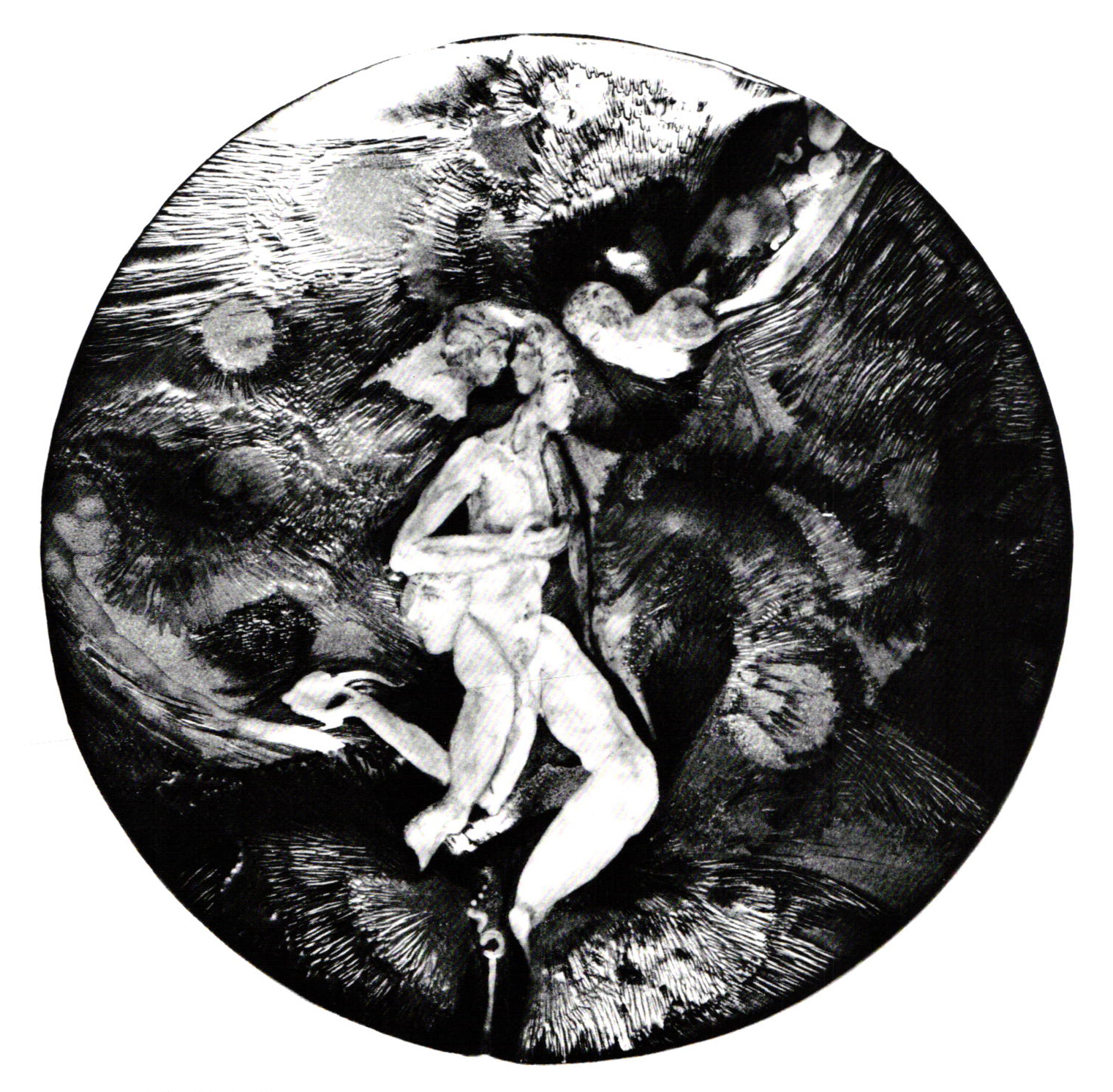 Marriage to fiber artist Lenore Davis in 1968 enhanced both his interaction with the art community and his own creative energies. Early Helwig grisailles suggest interesting parallels to Davis's use of the human figure as landscape. Both grew up in the flatlands (Kansas and Montana), with similar spatial landscapes of interminable blue skies and unbroken horizons. As an independent, solitary child, Helwig seems to have later suffused his enamels with mythical figures from his reading, or with surrogate friends from his imagination as a way of counteracting that endless Kansan plain. Davis, the daughter of a forestry professor, used her ebullient figures to form the landscape and to protect its riches, ever mindful of the freedom such spaces provide. She seems to find the spaces liberating; he tends to find them restricting.